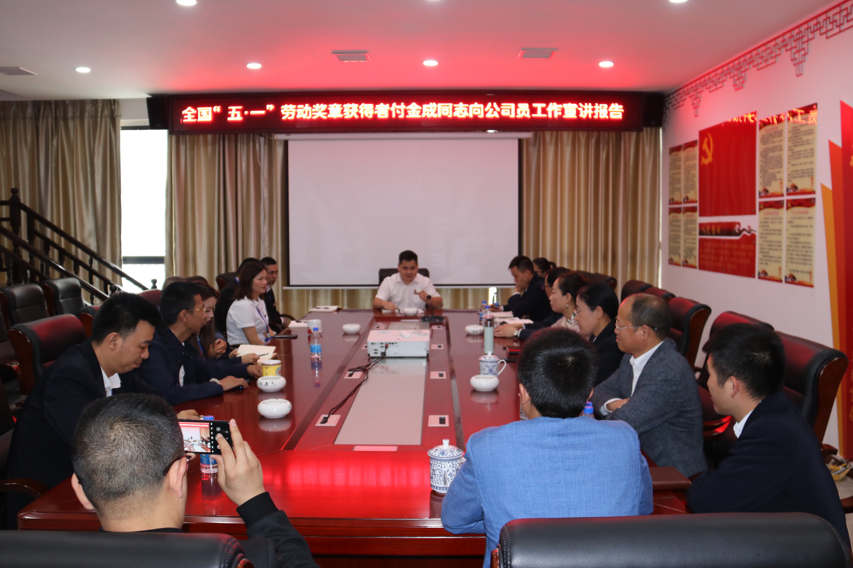 2021年5月30日下午,贵州通建建设工程有限公司在公司会议室举行全国五一劳动奖章获得者宣讲报告会,县人大常委会副主任、县工商联主席邰胜英、县委两新工委专职副书记杨旭、县委统战部副部长潘承渊、县总工会党组书记龙懿、县住建局副局长陆正彩等和贵州通建建设工程有限公司副董事长付清武、总经理李祖培以及公司全体员工,听取了荣获全国“五一劳动奖章”荣誉称号的付金成同志的宣讲报告,并与付金成同志进行座谈、互动交流。